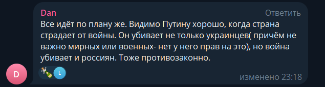 В то же время россияне устроили истерику и заявили, что их диктатору Путину хорошо, когда страна страдает от войны. Часть граждан РФ заявили, что главарь Кремля убивает не только украинцев, но и не против, когда убивают россиян.
